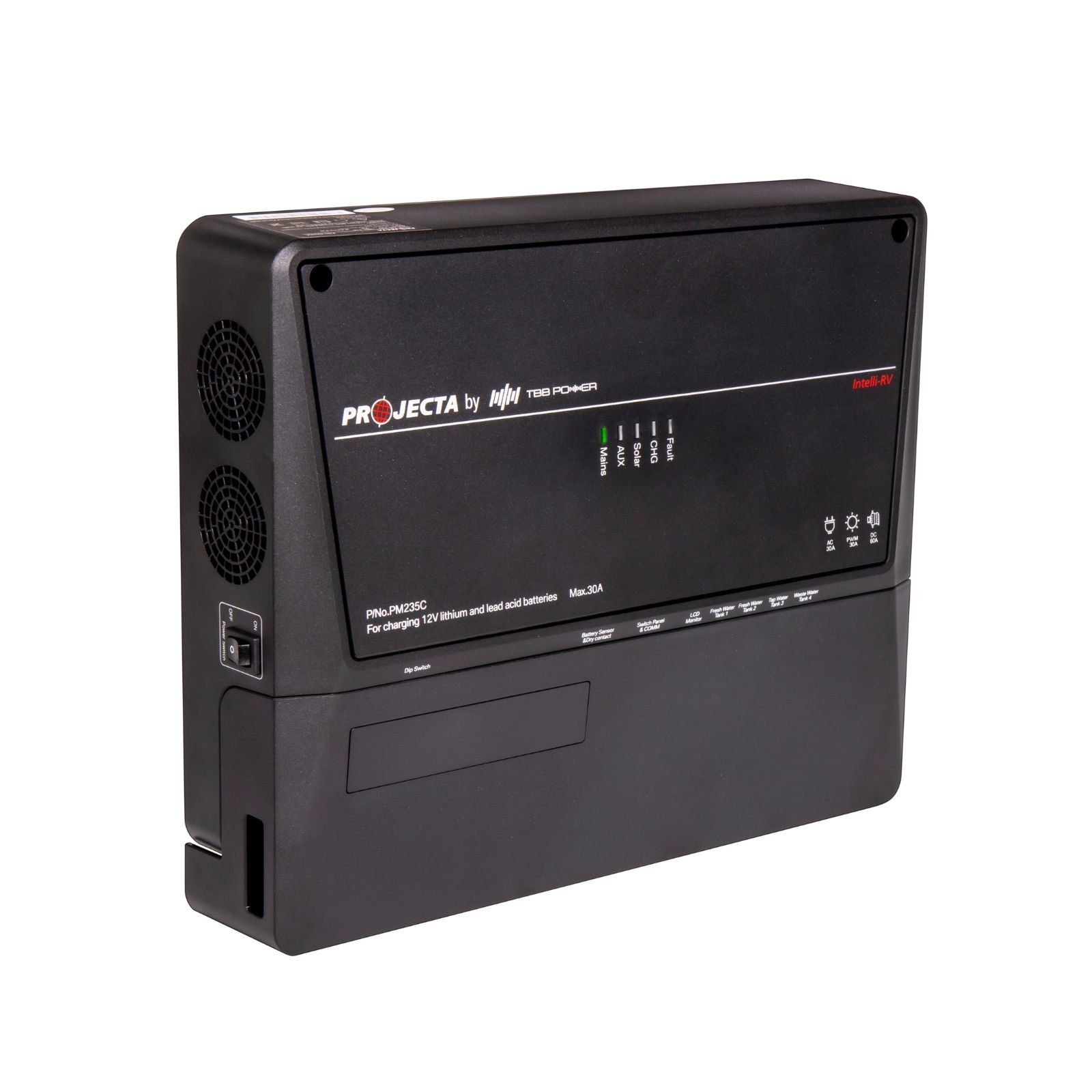 The PM235C is part of Projecta's Intelli-RV GEN II Low Profile range and serves as a compact power management unit. It centralizes wiring with a slim, low-profile design, making battery power and solar management straightforward. Key features include: