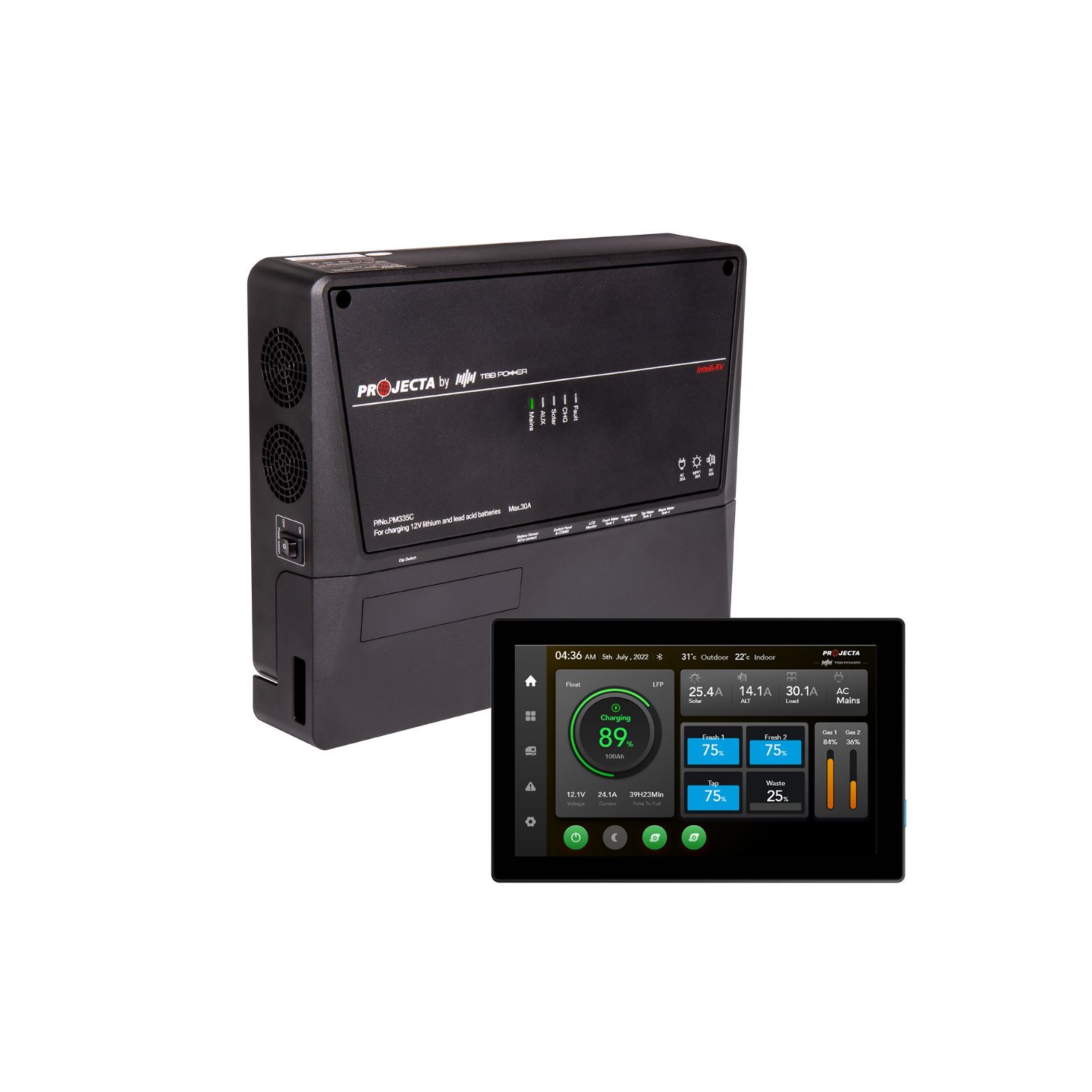 A comprehensive power management system to suit caravans and RVs featuring a 35A power supply and 30A AC/solar charger. Supplied with an advanced 7" Bluetooth LCD touch screen offering complete control and monitoring of battery, MPPT solar, water and electrical systems.